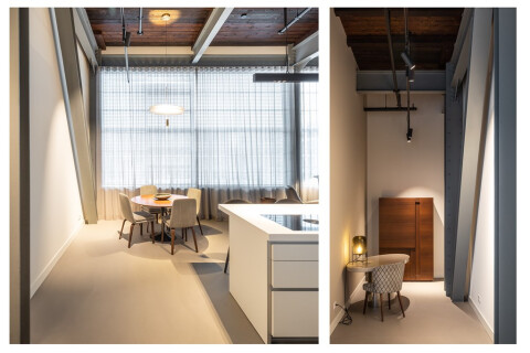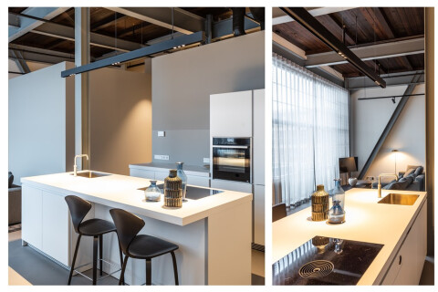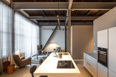 De indeling van dit appartement is zeer ruim en open opgezet en benadrukt het typische loftgevoel. De riante living met Frans balkon loopt over in een ruime eethoek en de open keuken met kookeiland. De keuken is voorzien van geïntegreerde koel- en vriescombinatie, bakoven met fullsteam, geïntegreerde vaatwasser (alles van Neff), een inductiekookplaat met ingebouwde kookveldafzuiging (van Bora) en een Quooker. Net om de hoek is een heerlijke werkplek gecreëerd. Aan de andere zijde is de slaapkamer gesitueerd met een en-suite badkamer. De slaapkamer is voorzien van Porro kledingkasten en Nilson double boxspringbedden met hoofdbord (180x200cm). De badkamer is voorzien van inloopdouche en een prettig wastafelmeubel met zitje. Daarnaast is er een apart toilet met fontein en een technische ruimte met wasmachine en droger uit de Exclusiv-lijn van Bosch. De gehele inrichting oogt prettig en comfortabel dankzij het ontwerp van Noort Interieur, aangelicht door verlichting van Modular Lighting Instruments en diverse decoratieve armaturen uit de collectie van Noort. Van de prachtige gietvloer tot de houten plafonds is dit appartement gevuld met luxe. Naast aandacht voor de high-end inrichting is ook extra aandacht besteed aan duurzaamheid. Zo is de loft geheel gasloos en uitgevoerd met vloerverwarming en -koeling middels de warmte- en koude-bronnen.