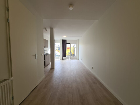 Entree aan de straatzijde via de gemeenschappelijke hal zijn de voordeuren te bereiken. Entree studio in de woonkamer (25m2) waaruit de badkamer (2.5m2) is te betreden, welk beschikt over een inloopdouche, wastafel met spiegelkast, handdoekenradiator en zwevend toilet. De woonkamer (25m2) bevindt zich aan de achterzijde en biedt door de grote ramen veel natuurlijk daglicht. De studio beschikt over een open keuken welk is uitgerust met een inbouw koelkast met vriesvak, een combi oven/magnetron, een 4 pits-inductie kookplaat, een inbouw RVS-afzuigkap, een inbouw vaatwasmachine, een gootsteen met mengkraan en voldoende opbergruimte. De studio beschikt eveneens over een eigen achtertuin.