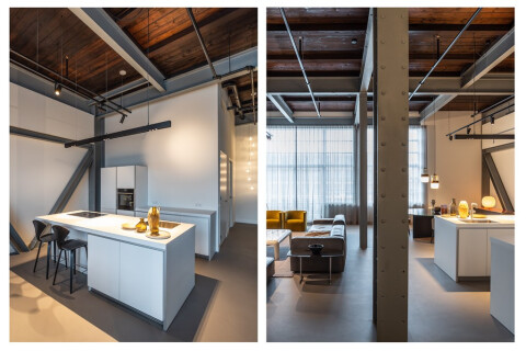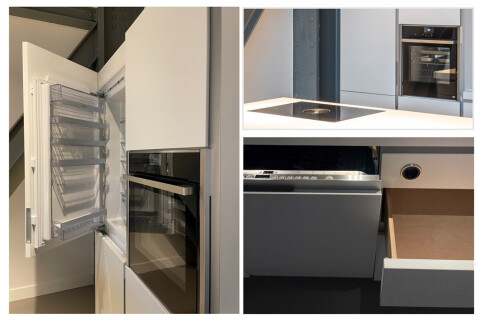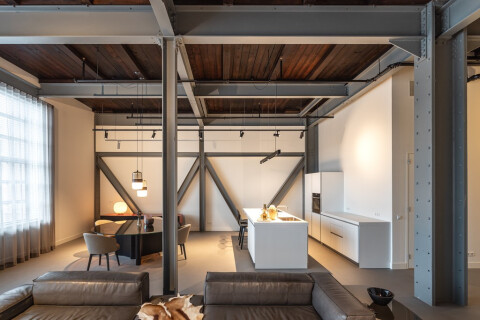 De indeling van dit appartement is zeer ruim en open opgezet en benadrukt het typische loftgevoel. De riante living met Frans balkon loopt over in een ruime eethoek en de open keuken met kookeiland. De keuken is voorzien van geïntegreerde koel- en vriescombinatie, bakoven met fullsteam, geïntegreerde vaatwasser (alles van Neff), een inductiekookplaat met ingebouwde kookveldafzuiging (van Bora) en een Quooker.