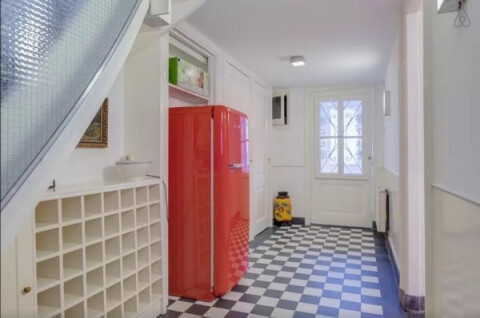 Long entrance hall with access to the bathroom and toilet. Separate room for washer and dryer and plenty of closets in the old style of this monumental building.